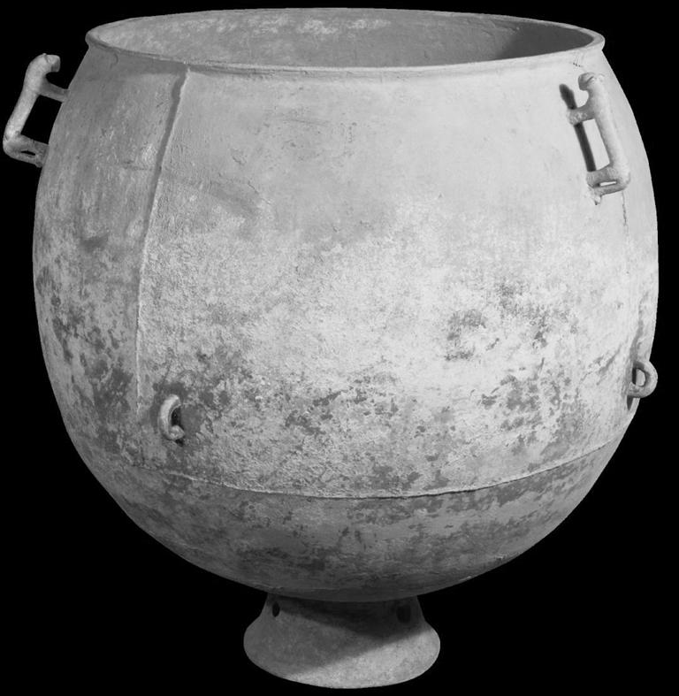 這件青銅鍑的鑄造帶著游牧民族的特點(diǎn),先分后合, 分塊鑄造然后焊接而成。這是一件罕見的秦末漢初匈奴鑄造的大型青銅鍑,其時(shí)間大概在戰(zhàn)國(guó)到漢初。