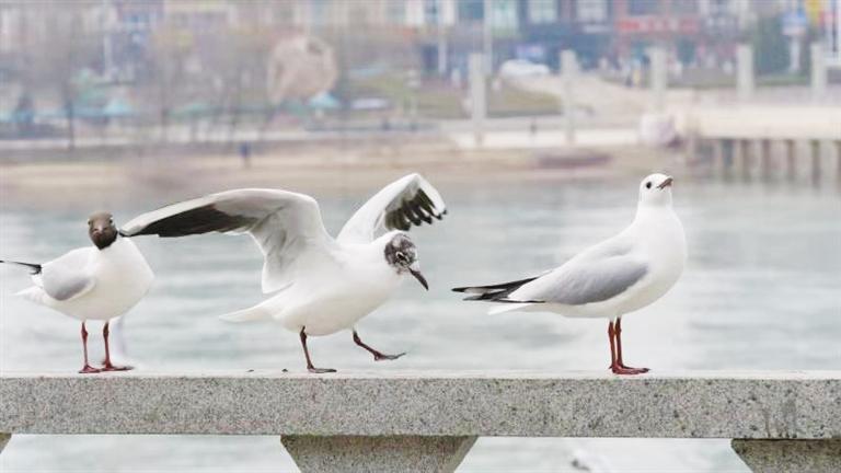 紅嘴鷗,俗稱水鴿子,體形和毛色都與鴿子相似,嘴和腳皆呈紅色,身體大部分的羽毛是白色,尾羽黑色。紅嘴鷗喜集群,在世界的許多沿海港口、湖泊都可見到,多數(shù)在中國東部及北緯32度以南湖泊、河流及沿海地帶越冬。