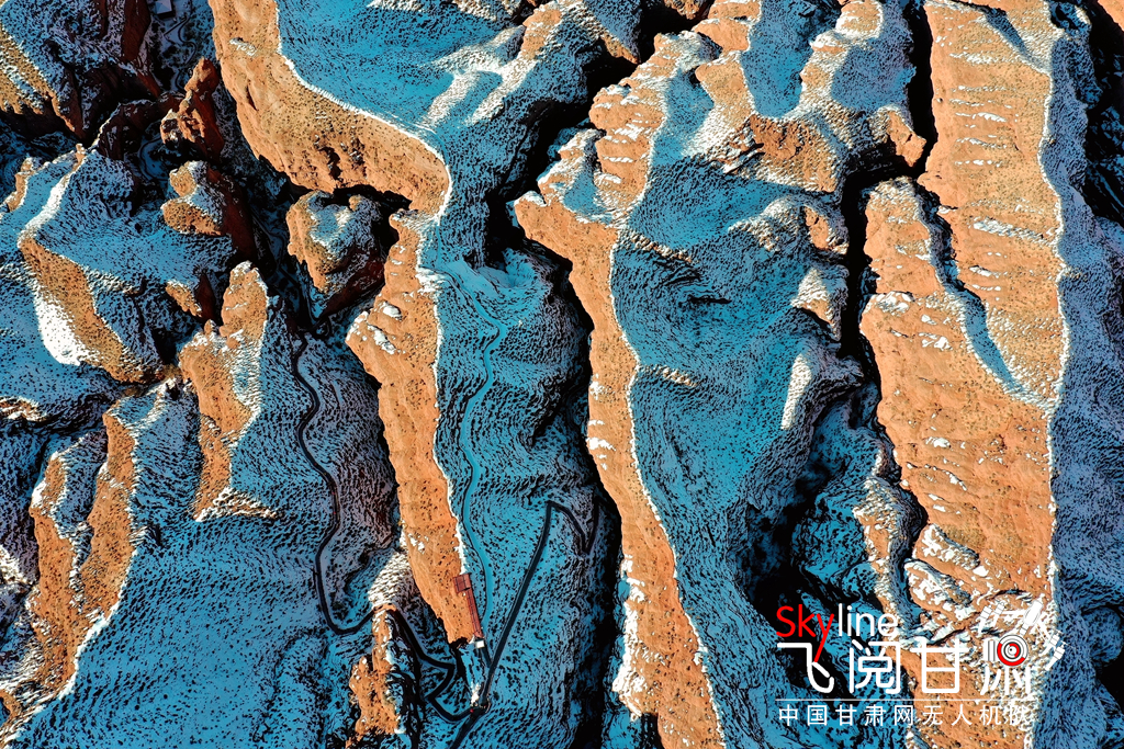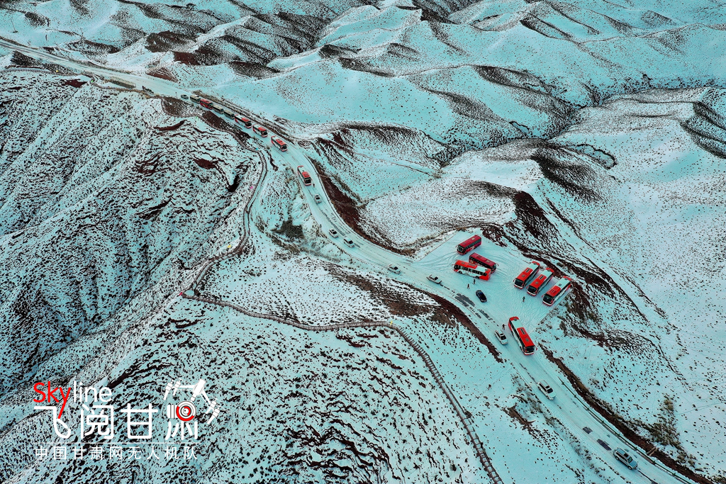 12月26日,俯瞰大雪覆蓋的甘肅省張掖平山湖大峽谷景區(qū),銀裝素裹中顯露出褐色丹霞,宛如一幅美麗畫卷,吸引眾多的游客踏雪賞景。(無人機(jī)照片)