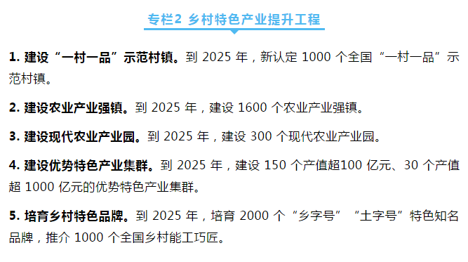 ——鄉(xiāng)村特色產(chǎn)業(yè)深度拓展。培育一批產(chǎn)值超百億元、千億元優(yōu)勢特色產(chǎn)業(yè)集群,建設一批產(chǎn)值超十億元農(nóng)業(yè)產(chǎn)業(yè)鎮(zhèn)(鄉(xiāng)),創(chuàng)響一批“鄉(xiāng)字號”“土字號”鄉(xiāng)土品牌。