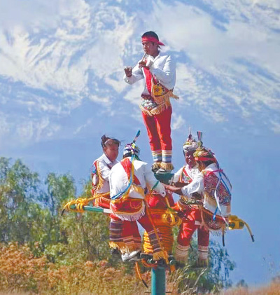 這些舞者表演的是墨西哥傳統(tǒng)的“飛天舞”儀式。“飛天舞”在墨西哥韋拉克魯斯州的托托納克人中盛行,現(xiàn)已成為該州帕潘特拉市代表性的文化標(biāo)志。2009年,這項民間技藝被聯(lián)合國教科文組織列入人類非物質(zhì)文化遺產(chǎn)代表作名錄。