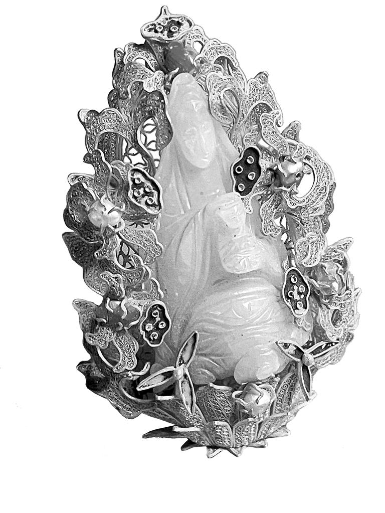 1986年,蘭州市博物館對(duì)白衣寺塔進(jìn)行整體維護(hù),從塔剎天宮處發(fā)現(xiàn)明代珍貴文物46件,其中有《大方廣佛華嚴(yán)經(jīng)》、鎏金釋迦牟尼銅造像、明代印花絲巾等文物,尤其是金蓮玉雕抱子觀音簪和金蓮玉雕魚籃觀音簪,造型精致,做工精美,表現(xiàn)了很高的明代金累絲手工制造技術(shù)水平,簪柄有銘文21字,“崇禎五年捌月初拾日肅王妃熊氏施伴讀姚進(jìn)兼裝”,被定級(jí)為國家一級(jí)文物。