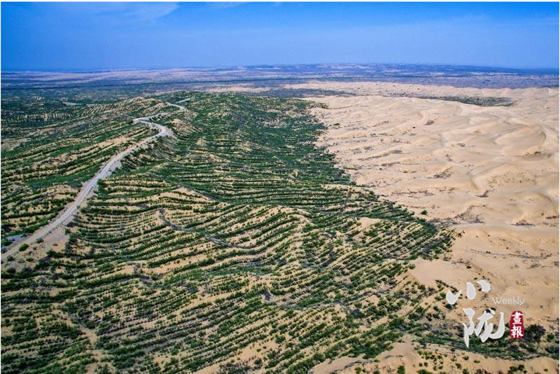 壓沙播綠,人進(jìn)沙退。40年來(lái),民勤縣以流沙治理為重點(diǎn),累計(jì)完成工程壓沙131.2萬(wàn)畝,人工造林313.53萬(wàn)畝。