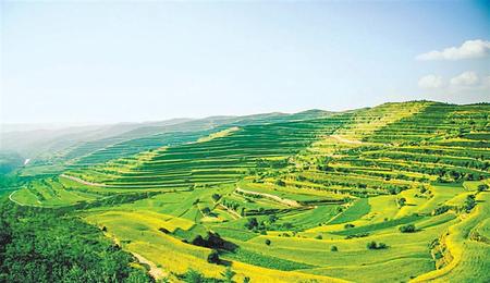 夏日時(shí)節(jié)的莊浪縣,滿眼盡是綠色。站在高處遠(yuǎn)眺,層層梯田依山勢(shì)錯(cuò)落分布,好似黃土高原上泛起的彩色波浪。