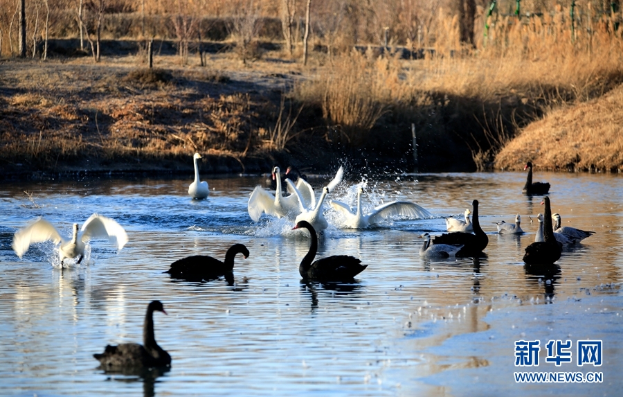 冬日清晨的甘肅省張掖國家濕地公園里碧波蕩漾,成群的白天鵝、黑天鵝等鳥類聚在一起游弋嬉戲,歡騰跳躍,成為一道亮麗的風(fēng)景線,吸引眾多游客觀賞拍照。新華網(wǎng)發(fā)(陳禮 攝)