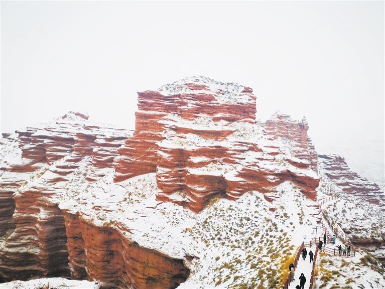 游客在景區(qū)觀景臺上伸手可觸摸到被白雪覆蓋的火紅色彩,峽谷內,山倚壁蜿蜒,峰隨地勢崢嶸,石林犬牙交錯,游客不時發(fā)出由衷的贊嘆,眼前的風光如仙境一般。