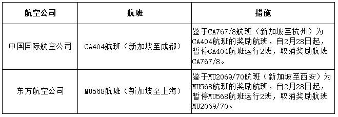 根據(jù)民航局通報(bào),2月9日入境的中國(guó)國(guó)際航空公司CA404航班(新加坡至成都)確診新冠肺炎旅客5例,鑒于CA767/8航班(新加坡至杭州)為CA404航班的獎(jiǎng)勵(lì)航班,自2月28日起,暫停CA404航班運(yùn)行2班,取消獎(jiǎng)勵(lì)航班CA767/8。2月10日入境的東方航空公司MU568航班(新加坡至上海)確診新冠肺炎旅客5例,鑒于MU2069/70航班(新加坡至西安)為MU568航班的獎(jiǎng)勵(lì)航班,自2月28日起,暫停MU568航班運(yùn)行2班,取消獎(jiǎng)勵(lì)航班MU2069/70。上述熔斷的航班量不得用于其它航線。