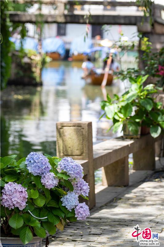 花團(tuán)錦簇一詞大約是為繡球量身定制,微風(fēng)一曳,波光親吻一曳。藍(lán)紫開遍,彌漫的淡淡花香讓春天的信使忍不住沉溺其中,周莊的浪漫大抵關(guān)乎世間一切。