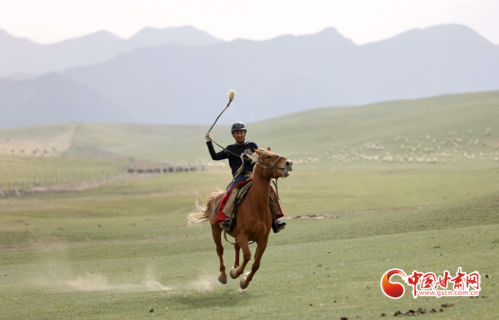 夏日,位于祁連山北麓的甘肅張掖山丹馬場(chǎng)綠草如茵,牧馬人揚(yáng)鞭催馬,山丹馬場(chǎng)再現(xiàn)萬馬奔騰景象。