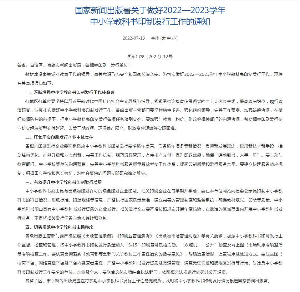13日,國家新聞出版署網(wǎng)站發(fā)布《國家新聞出版署關(guān)于做好2022—2023學(xué)年中小學(xué)教科書印制發(fā)行工作的通知》(以下簡稱《通知》)。其中強調(diào),各相關(guān)印刷發(fā)行企業(yè)要積極適應(yīng)中小學(xué)教科書印制發(fā)行要求逐年提高、任務(wù)逐年增多等新情況?!锻ㄖ返淖詈蟊硎?,要切實規(guī)范中小學(xué)教科書市場秩序。