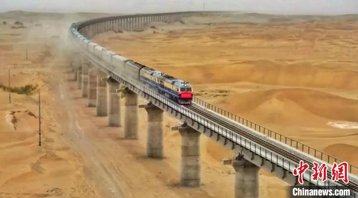 奔跑在塔克拉瑪干沙漠沙漠里和若鐵路上的列車。資料圖 新疆鐵路部門(mén)供圖