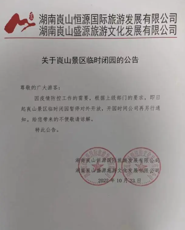 10月25日電 10月24日,崀山旅游區(qū)發(fā)布《關(guān)于崀山景區(qū)臨時(shí)閉園的公告》稱,因疫情防控工作的需要,根據(jù)上級(jí)部門的要求,10月24日起崀山景區(qū)臨時(shí)閉園,暫停對(duì)外開放,開園時(shí)間將另行通知。