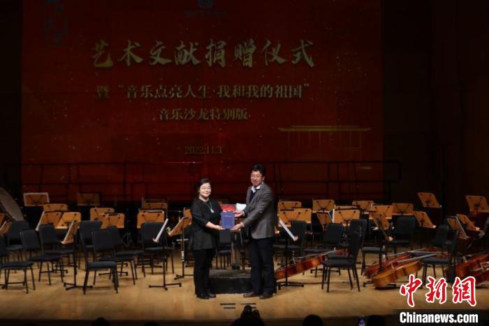 國家圖書館重要藝術(shù)文獻(xiàn)捐贈(zèng)儀式暨“音樂點(diǎn)亮人生·我和我的祖國——音樂沙龍?zhí)貏e版”活動(dòng)3日晚在國圖藝術(shù)中心·音樂廳舉辦。國家圖書館黨委書記、副館長(zhǎng)魏大威接受捐贈(zèng),并為捐贈(zèng)人代表中央民族歌舞團(tuán)民樂團(tuán)團(tuán)長(zhǎng)馬蘭花頒發(fā)捐贈(zèng)證書。
