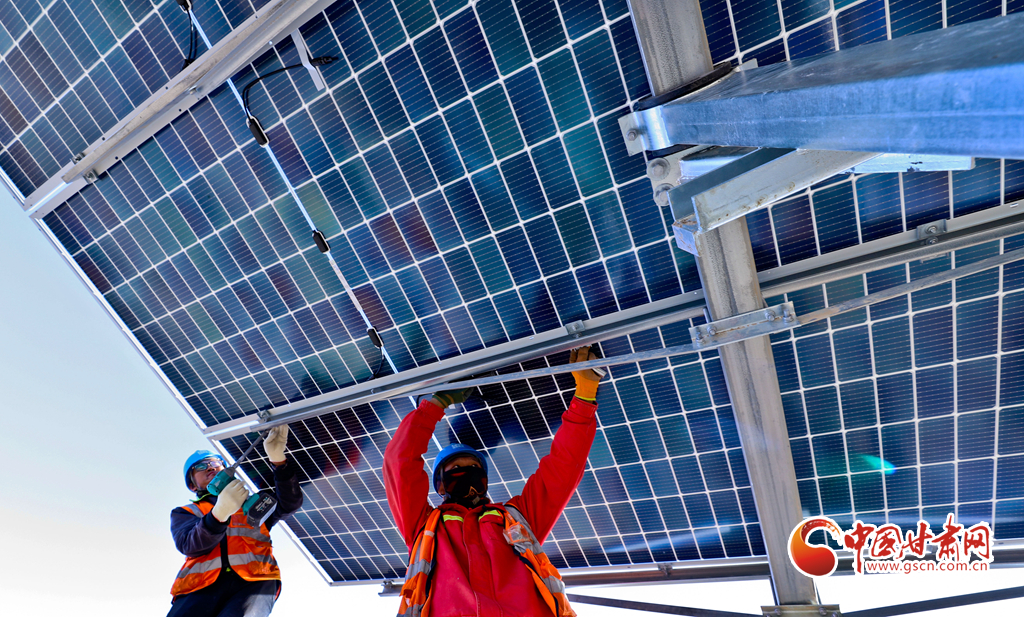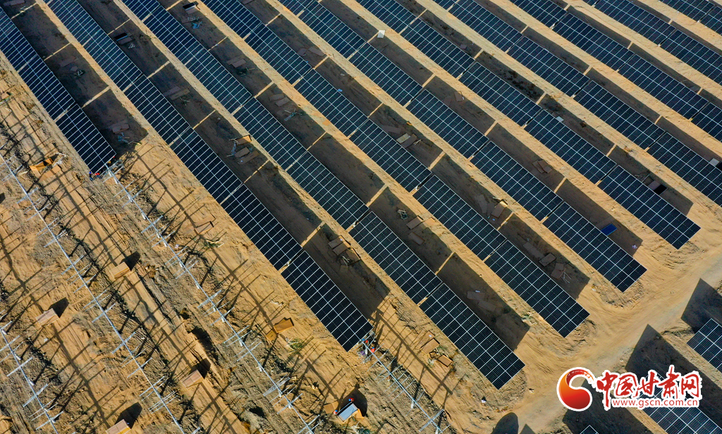 11月17日,甘肅省張掖市甘州區(qū)南灘中能綠電南灘30萬千瓦光伏建設(shè)現(xiàn)場(chǎng),工人們正在安裝光伏板。
