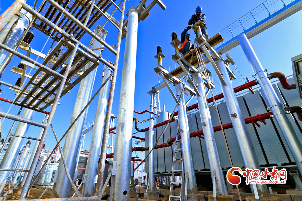 11月17日,甘肅省張掖市甘州區(qū)南灘中能綠電南灘30萬千瓦光伏建設(shè)現(xiàn)場(chǎng),工人們正在進(jìn)行變電設(shè)備安裝。