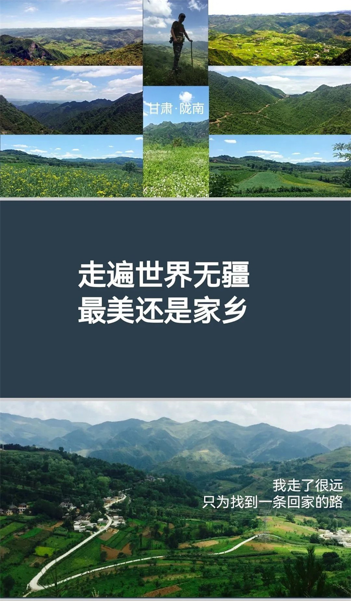 我每次回到西北各省區(qū)參加活動,做演講分享時,總會放幾頁PPT介紹我的家鄉(xiāng)——大隴南,配圖都是我拍攝的我們村莊附近的風(fēng)光,也經(jīng)常說一句話——“走遍世界無疆,最美還是家鄉(xiāng)”,不辭長作隴南人。