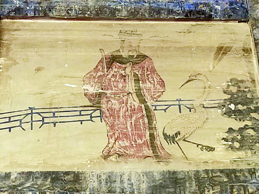 戲樓內(nèi)二簾額板和梁柱上較好地保存了許多清代彩畫,其中以墨書“太古元音”和彩畫“天官賜福圖”最為精彩。