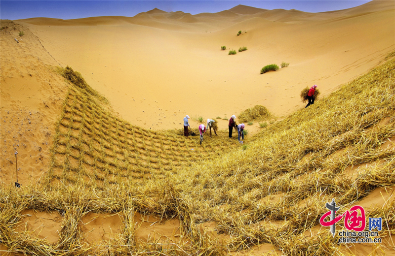 小小的“麥草方格”不僅阻止了流沙,防止了荒漠化,還加速了當?shù)亟洕陌l(fā)展。“麥草方格”固沙法即:將廢棄的麥草呈方格狀鋪在沙面上,然后用鐵鍬軋進沙中,留麥草的三分之一或一半立在四周,并在方格中植入治沙人經九次試驗成功培育出的花棒、檸條等沙生植物,腐爛干枯的麥草還作為肥料滋養(yǎng)植物的生長。