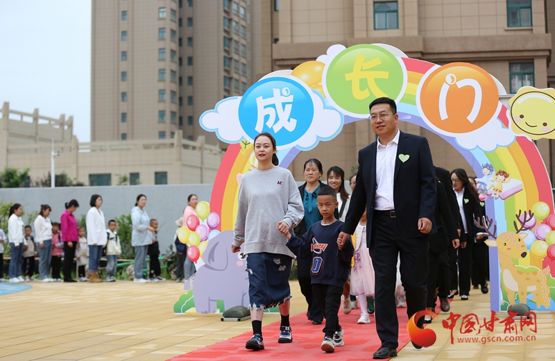 一年級(jí)新生在老師和家長(zhǎng)的陪伴下走過(guò)“成長(zhǎng)門(mén)”