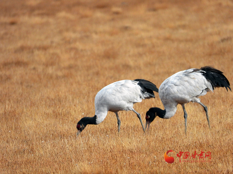 中國甘肅網(wǎng)10月17日訊 (西北角·中國甘肅網(wǎng)記者 張慧雅)近日,甘肅祁連山國家級自然保護(hù)區(qū)工作人員在轄區(qū)巡護(hù)時(shí)偶遇國家一級保護(hù)野生動(dòng)物黑頸鶴歇息覓食的場景,兩只黑頸鶴漫步在一處濕地中一邊欣賞美景一邊享用美食。