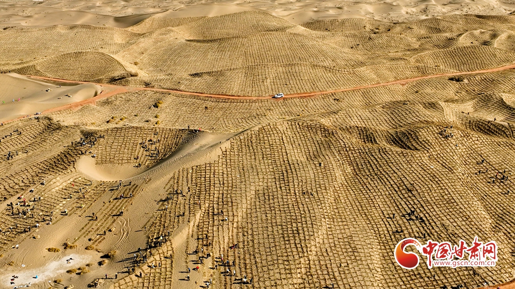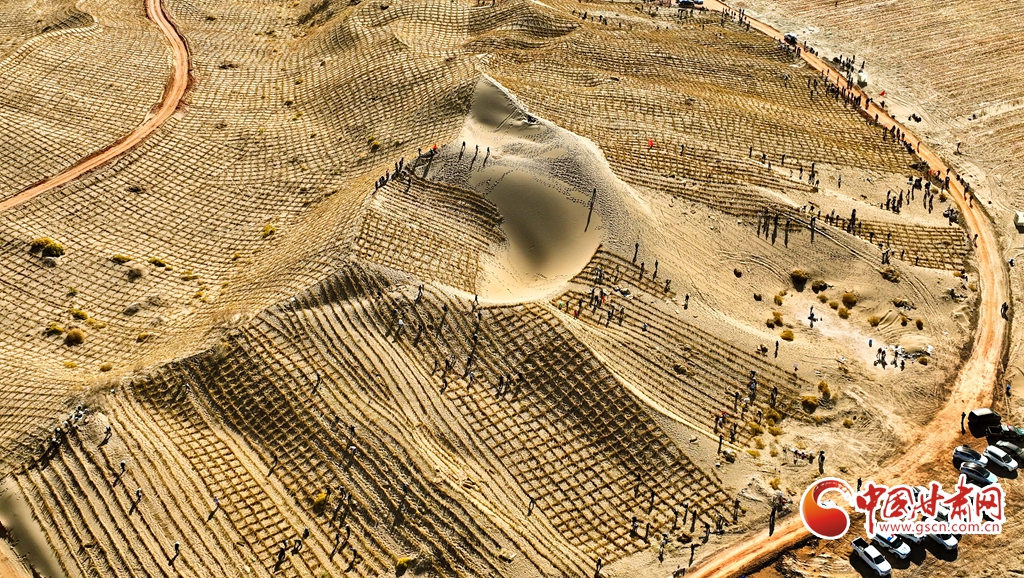 10月31日,河西走廊——塔克拉瑪干沙漠邊緣阻擊戰(zhàn)張掖區(qū)域戰(zhàn)役正式啟動,張掖市千名市民來到高臺縣巴丹吉林沙漠南緣西沙窩風(fēng)沙口治理區(qū)共同義務(wù)壓沙障。