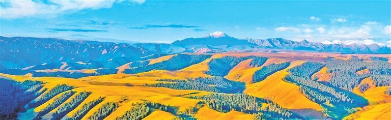 初冬的祁連山,顯示出獨(dú)特韻味。主峰在藍(lán)天白云的映襯下顯得肅穆大氣。周圍群峰羅列、層巒疊嶂,高低延綿的山脈在陽光的照耀下交相輝映,近處的群山被此起彼伏的林海包圍,像一道道美麗的波浪。祁連山脈山高、天藍(lán),大自然賜予這片土地最原始的靈秀與遼闊。