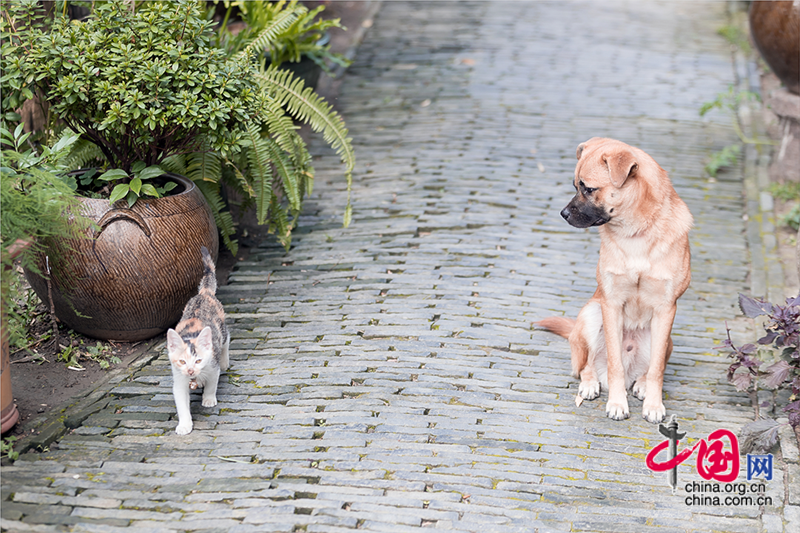 行在青石板路上,總會遇到不同的「原住民」和主人,狹路相逢時(shí),倏地就跑進(jìn)了自己的地盤。