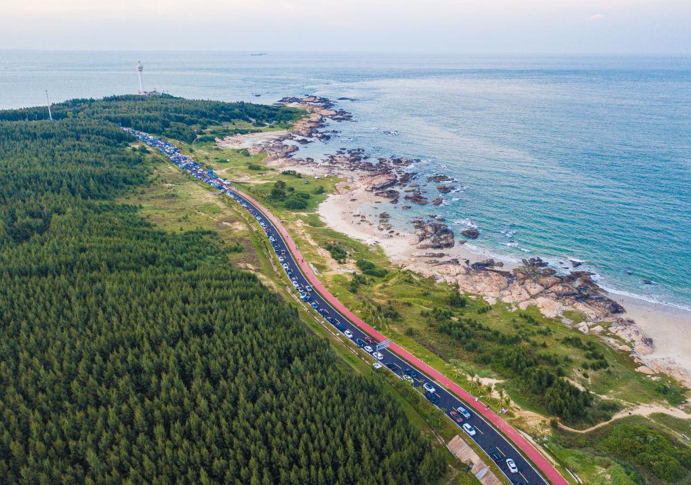 ↑2023年10月4日拍攝的海南環(huán)島旅游公路文昌段景色和自駕游車輛(無人機(jī)照片)。新華社記者 蒲曉旭 攝
