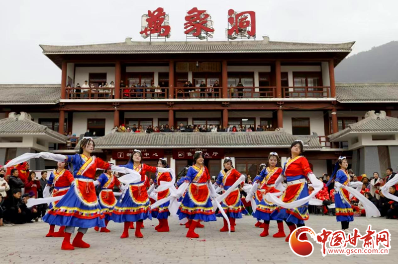 2024年2月21日,在甘肅省隴南市國家AAAA級景區(qū)——武都區(qū)萬象洞風景名勝區(qū),當?shù)厝罕娊M織的社火表演隊正在演出。
