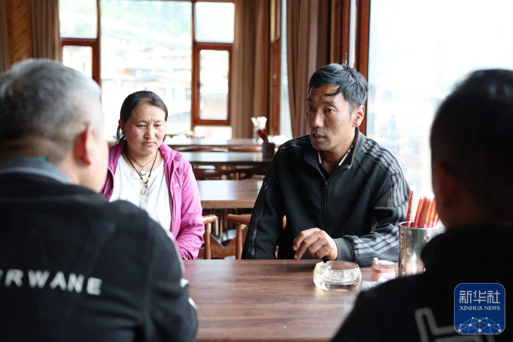 ↑ 扎尕那景區(qū)一家民宿經(jīng)營者卓瑪交(右)在自家的民宿里和員工交流如何提高服務水平(6月27日攝)。新華社記者 方欣 攝