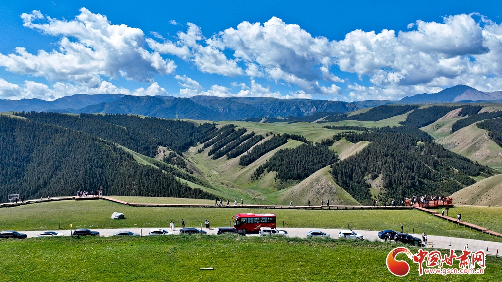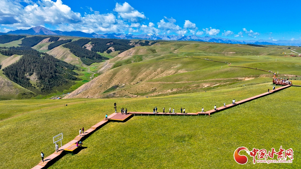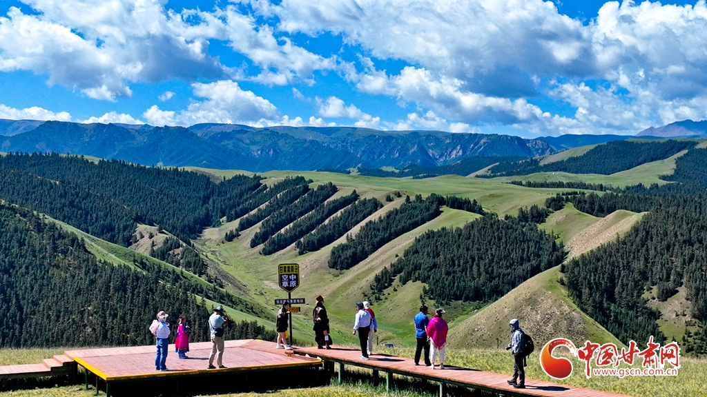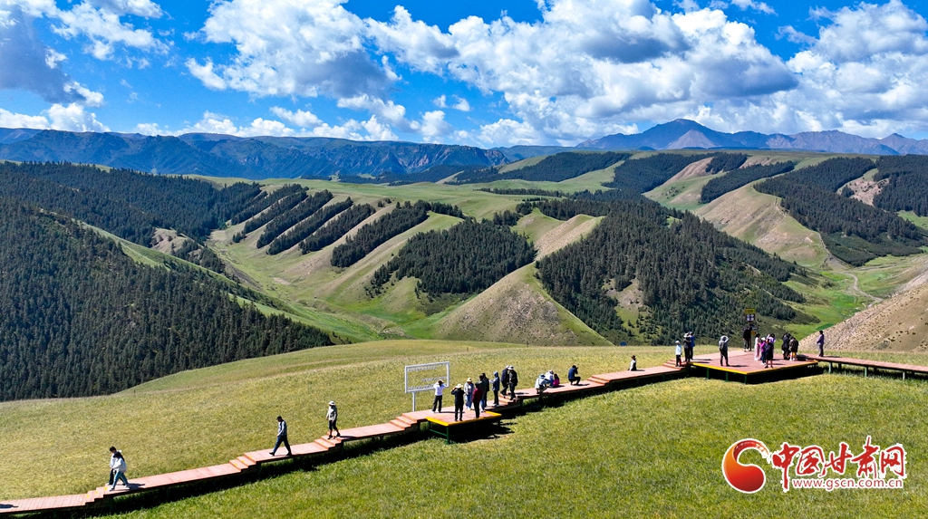 8月3日,祁連山國家公園甘肅省張掖市肅南裕固族自治縣康樂草原段迎來一年最美時光,游客在藍(lán)天、白云、森林、草原融為一體的旖旎風(fēng)光中拍照留念。