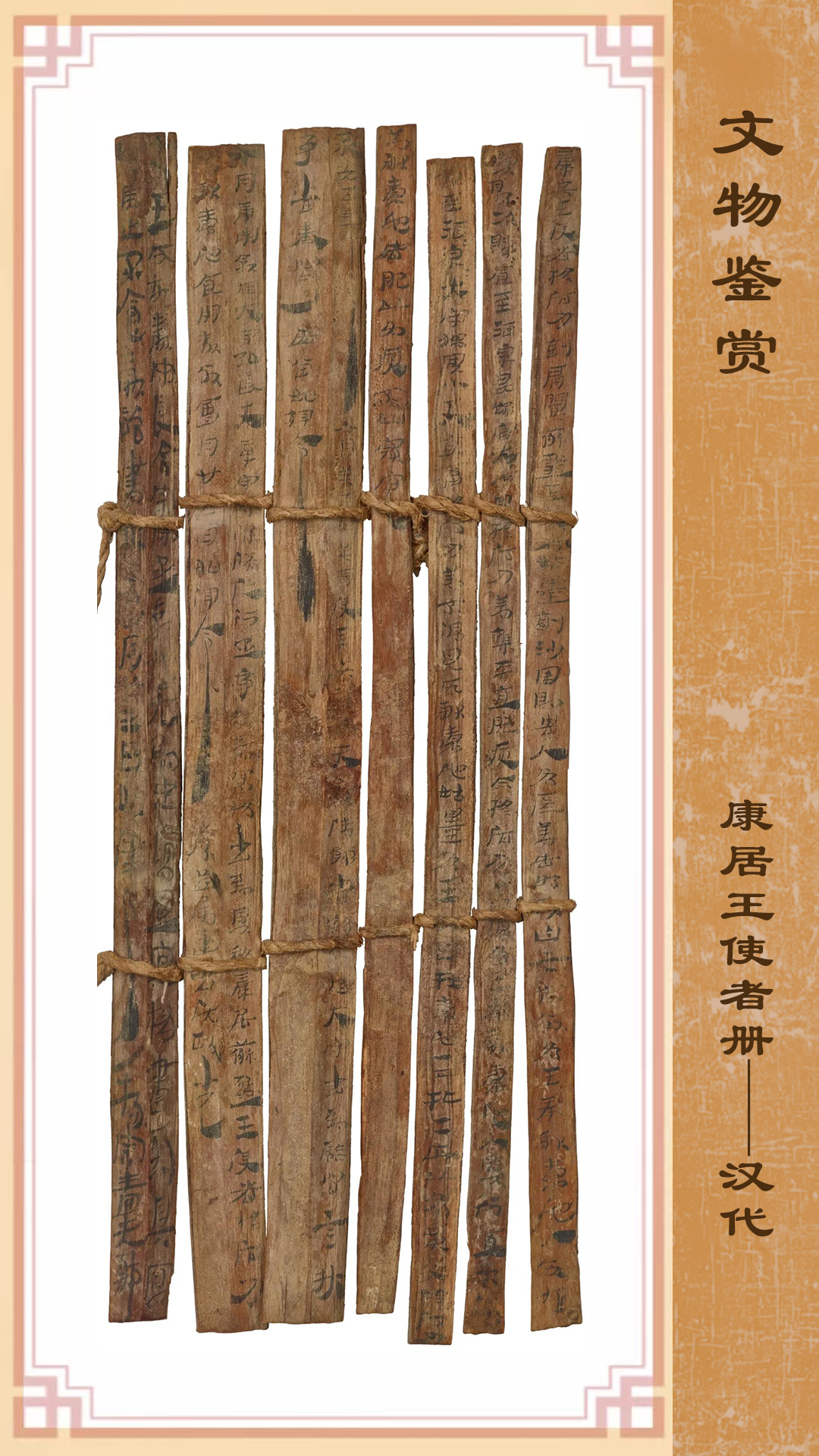 這份珍貴冊書記錄內(nèi)容為:永光五年(公元前39年),康居王使者和蘇薤王使者及貴人所獻的貢物在酒泉評估時發(fā)生了糾紛,朝廷責令敦煌郡和效谷縣進行調(diào)查并將當時的情況如實上報。該冊書的出土,不僅為研究當時的行政和司法審判程序提供了第一手資料,更重要的是為研究漢朝與康居國的關系提供了原始資料,亦是今天的中亞各國研究本國古代歷史的重要資料,可補傳世史籍之闕載。現(xiàn)藏甘肅簡牘博物館。