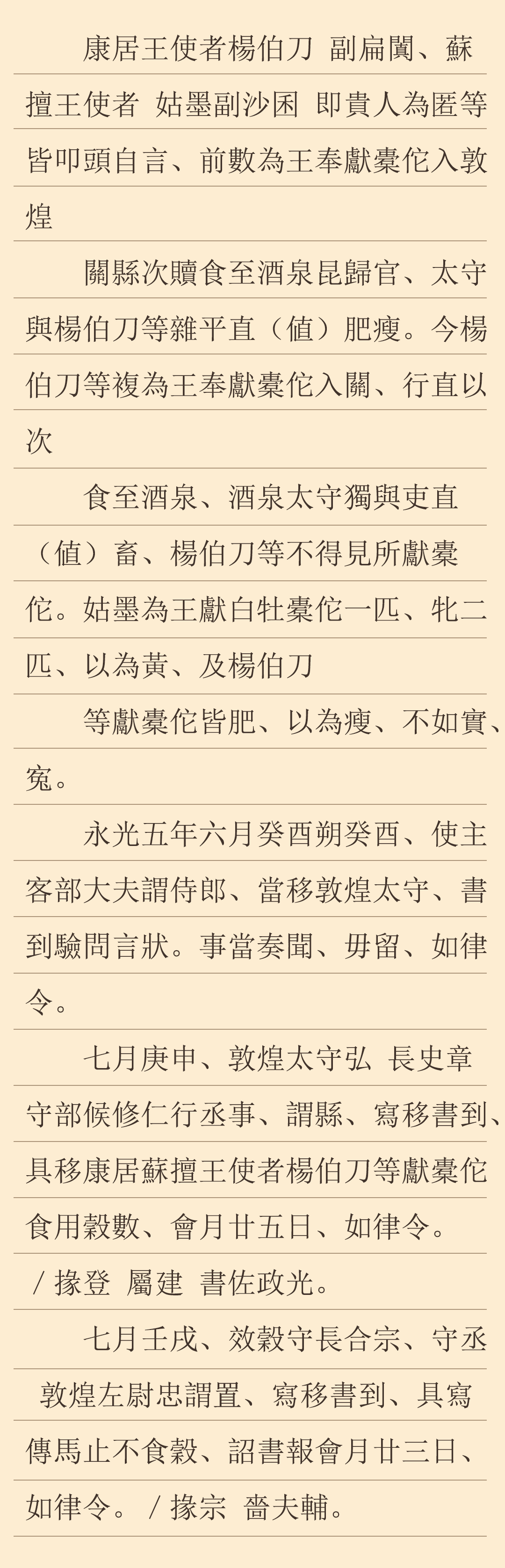 永光五年六月初一日(公元前39年7月21日),朝廷主管對外交往和蠻夷事務的使主客諫大夫行文敦煌,要求敦煌太守接到文件后對此進行查詢并按時上報中央,不得留遲。七月庚申(9月6日),敦煌大守弘、長史章以及兼行丞事的守部候修仁聯(lián)署文件,下發(fā)效谷縣,要求縣廷接到文件后,將康居王使者路過縣境時為之提供的谷物數(shù)量,在七天之內(nèi)上報太守府。文書中有發(fā)文時掾、屬、書佐的具名。