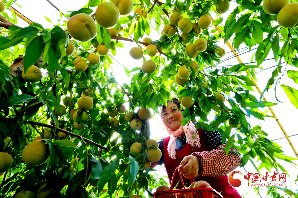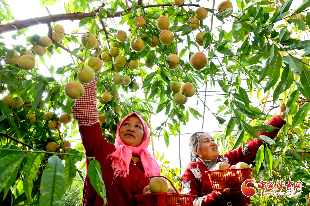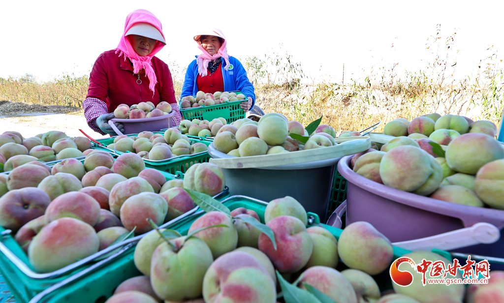 10月24日,在張掖市甘州區(qū)長安鎮(zhèn)萬通果蔬種植專業(yè)合作社“甘泉雪桃”種植基地大棚內,種植戶正在為甘肅蘭州和青海西寧的客戶采摘裝運“甘泉雪桃”。