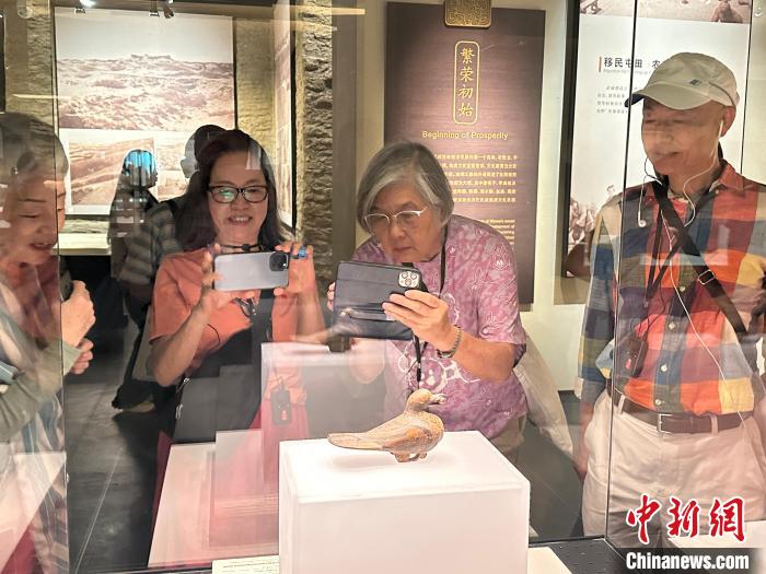 圖為游客在參觀彩繪漆木鳩。 戴文昌 攝