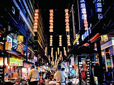 從亞歐商廈向東行,不久便到了張掖路步行街。夜幕降臨,夜市攤車的燈帶漸次亮起,也為這座城市的夜生活打開了開關(guān)。