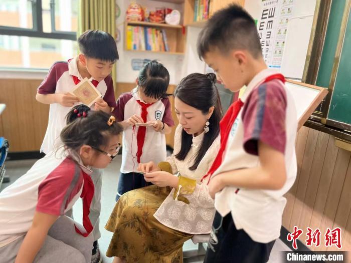6月,國(guó)家級(jí)非物質(zhì)文化遺產(chǎn)代表性項(xiàng)目民間繡活(夏布繡)市級(jí)代表性傳承人吳婉菁正在給幾位學(xué)生展示夏布繡。(受訪者供圖)