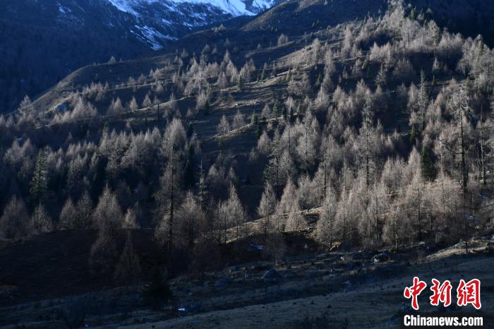12月2日,四川省阿壩州小金縣四姑娘山雙橋溝植被夕陽照射,形成一幅美麗畫卷。中新社記者 張浪 攝