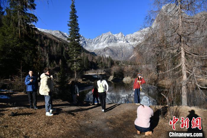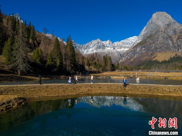 12月2日,位于四川省阿壩州小金縣的四姑娘山雙橋溝吸引游客游覽。隨著冬季到來,四姑娘山雙橋溝多座山峰被皚皚白雪覆蓋,紅葉、雪山倒映在清澈的湖面形成一幅美麗畫卷,冰雪旅游逐漸火熱。中新社記者 張浪 攝