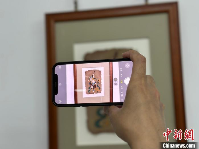12月17日,由蘭州市七里河區(qū)委宣傳部、七里河區(qū)文體旅局聯(lián)合舉辦的“大漠孤陽映彩霞 敦煌神韻美如畫”新時代文明實踐主題活動暨敦煌巖彩畫書畫藝術(shù)展拉開帷幕。圖為參觀者拍攝展出的“反彈琵琶”題材巖彩畫。楊娜 攝