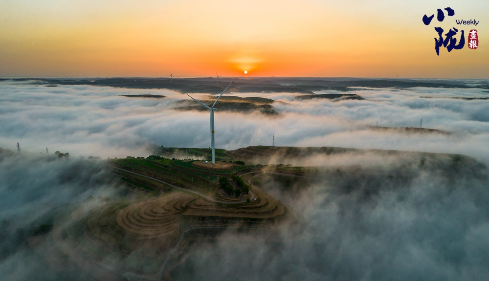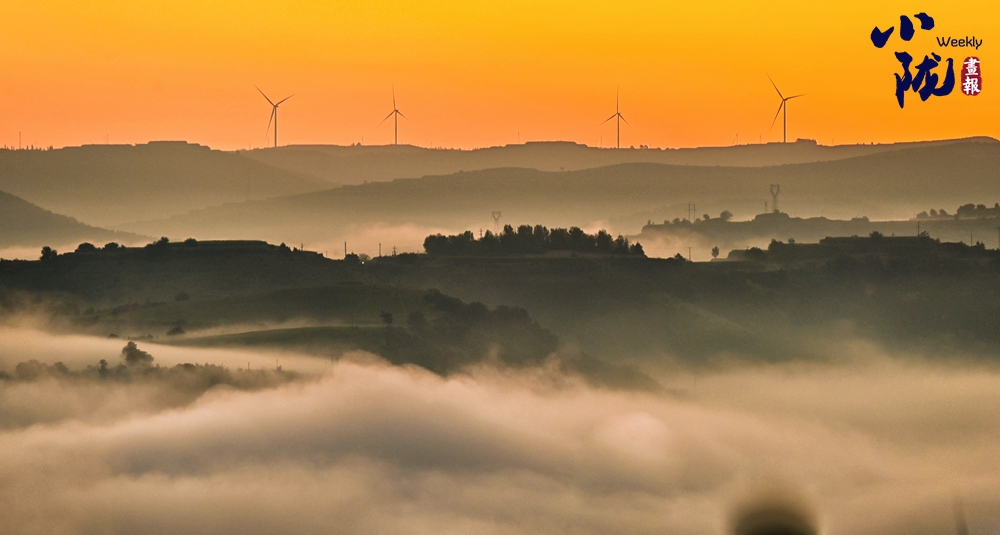 云霧如海浪般向四周漫延,呈現(xiàn)出別樣的霧海景觀,聳立在山川梁峁間的風(fēng)力發(fā)電機隨風(fēng)律動,成為當(dāng)?shù)匾坏廓毺氐娘L(fēng)景。
