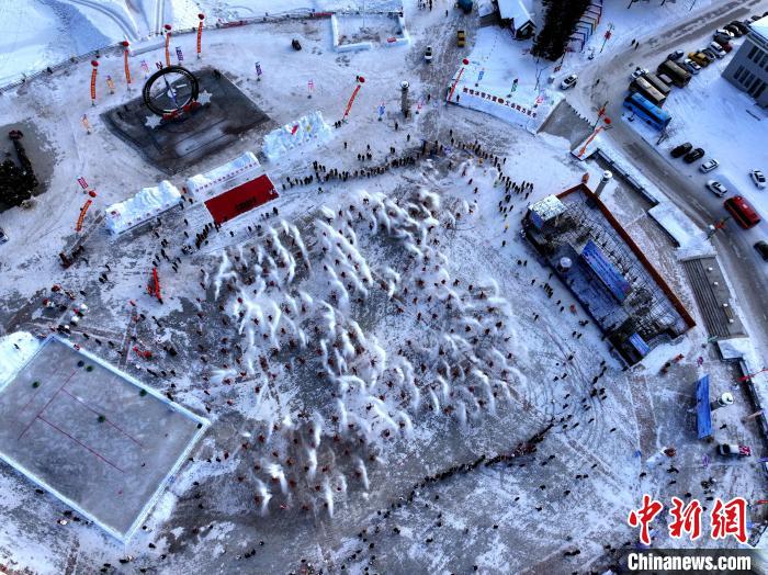 當(dāng)日,北極村七星廣場上,身披紅斗篷、頭戴紅帽子的游客和當(dāng)?shù)鼐用窠M成一個巨大的“53°”造型。伴隨著激情澎湃的音樂,他們擺好姿勢,將手中熱水奮力一灑,齊聲高喊“極致興安嶺 潑出好風(fēng)景”,一道道劃破天際的弧線,碰撞出的神奇光影。震撼的場面讓現(xiàn)場游客驚呼不已,他們紛紛舉起手機定格這個精彩瞬間。