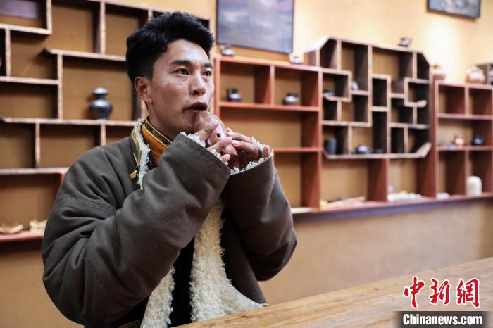 12月22日,在勒通古鎮(zhèn)的一家陶藝館內(nèi),陶藝師土登吹奏土陶制作的塤。中新社記者 薛蒂 攝