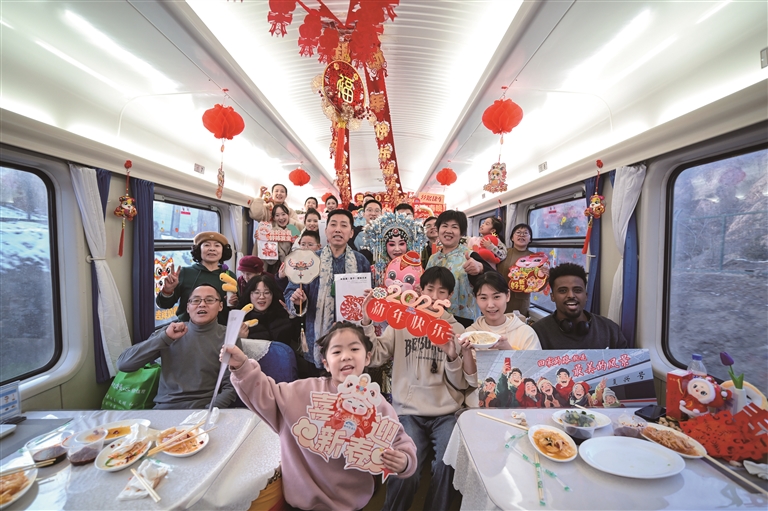 在歌聲、鼓聲、歡笑聲中,出鍋的餃子讓跨年列車的車廂年味更濃,把“春運回家”這一樸素而又濃烈的幸福感,通過舌尖味蕾傳遞,把“團圓便是年”“回家的路就是最美的風景”,通過餃子這一代表著中國人情愫強烈的文化符號,將天南海北奔赴山海的人們團聚在列車、歡度在旅途。