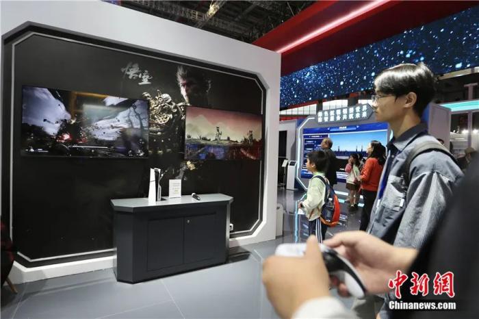 2024年11月5日至10日,第七屆中國國際進(jìn)口博覽會在上海舉辦。圖為11月9日觀眾在中國館體驗(yàn)游戲《黑神話:悟空》。中新社記者 王紫儒 攝