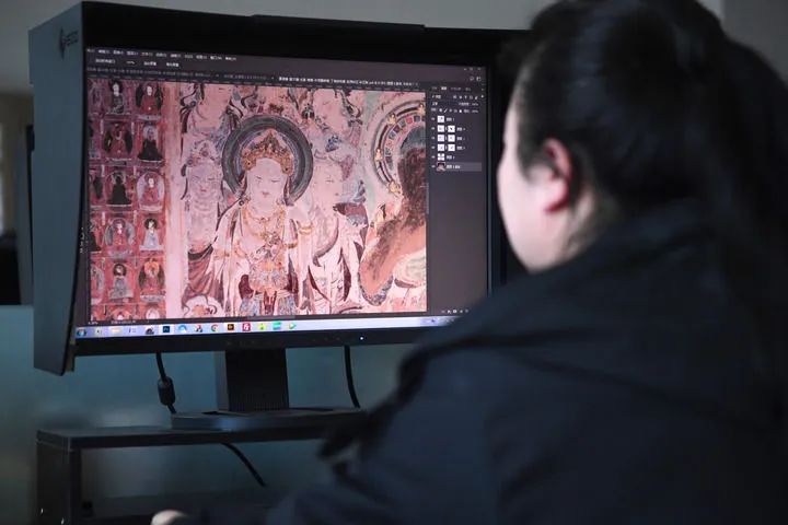 2023年4月25日,敦煌研究院文物數(shù)字化保護團隊圖像處理人員年海麗在拼接壁畫圖像。新華社記者 陳斌 攝