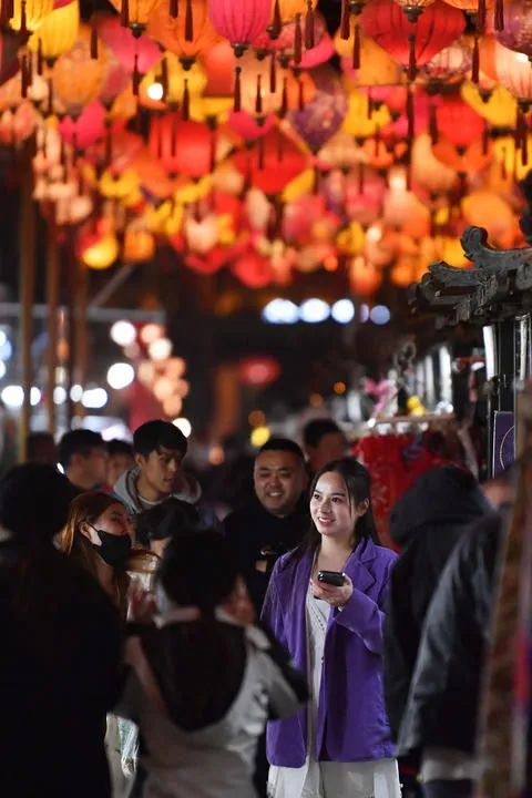 2023年3月16日,游客在敦煌夜市游覽。新華社記者 陳斌 攝