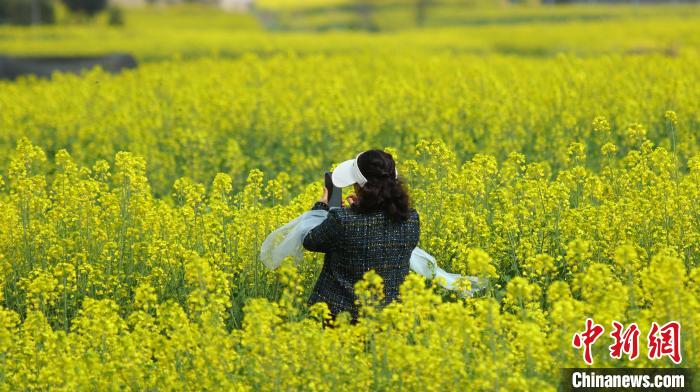近日,云南省騰沖市界頭鎮(zhèn)成片的油菜花盛開,吸引不少游客前來觀光。金黃的油菜花海與遠(yuǎn)處白墻黛瓦的村落相映成趣,共同繪就一幅寫意的水墨畫。圖為游客拍攝油菜花田。趙輝  攝