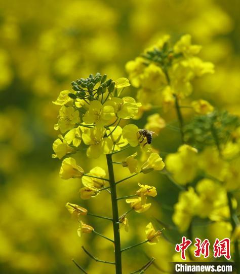 近日,云南省騰沖市界頭鎮(zhèn)成片的油菜花盛開,吸引不少游客前來觀光。金黃的油菜花海與遠(yuǎn)處白墻黛瓦的村落相映成趣,共同繪就一幅寫意的水墨畫。圖為油菜花吸引蜜蜂采蜜。趙輝  攝