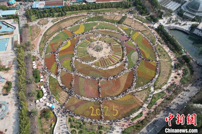 圖為游人來到巨型“玫瑰花型花海”中賞花。(無人機照片)中新社記者 楊華峰 攝